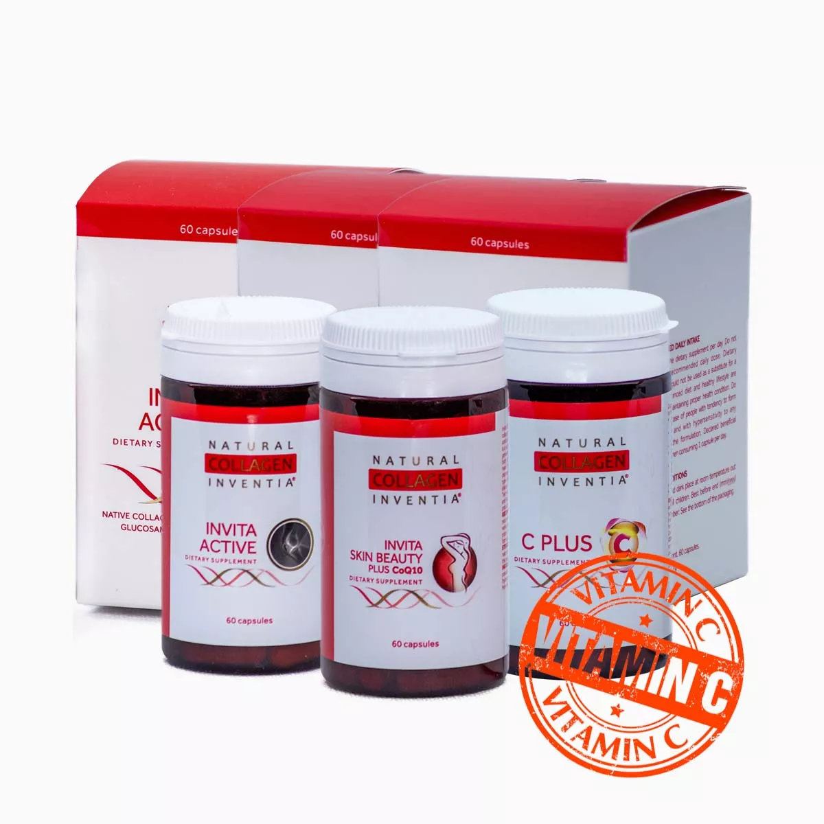 Synergické používání s „živým“ Přírodním kolagenem Inventia® – Triple Helix Formula nebo s kolagenovými kapslemi Invita Skin Beauty a Invita Active účinně podpoří holistické působení vitaminu C.